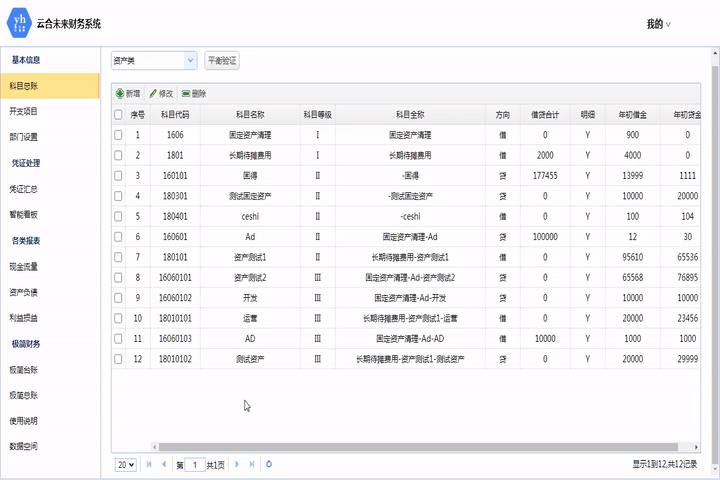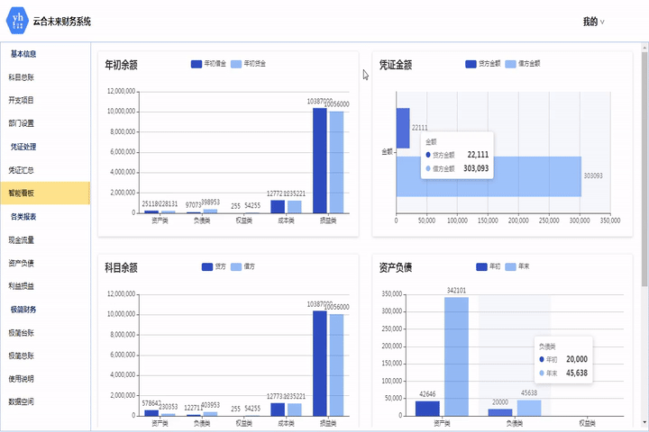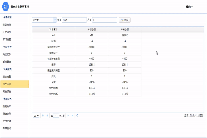 此模塊匯總所有科目的年初余額和年末余額,可按科目類型和時間查詢。