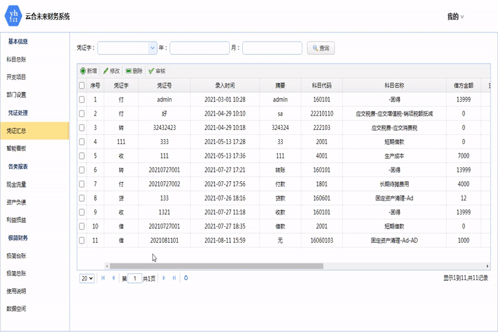 此模塊用于錄入憑證,可根據憑證字或時間查詢以往記錄。